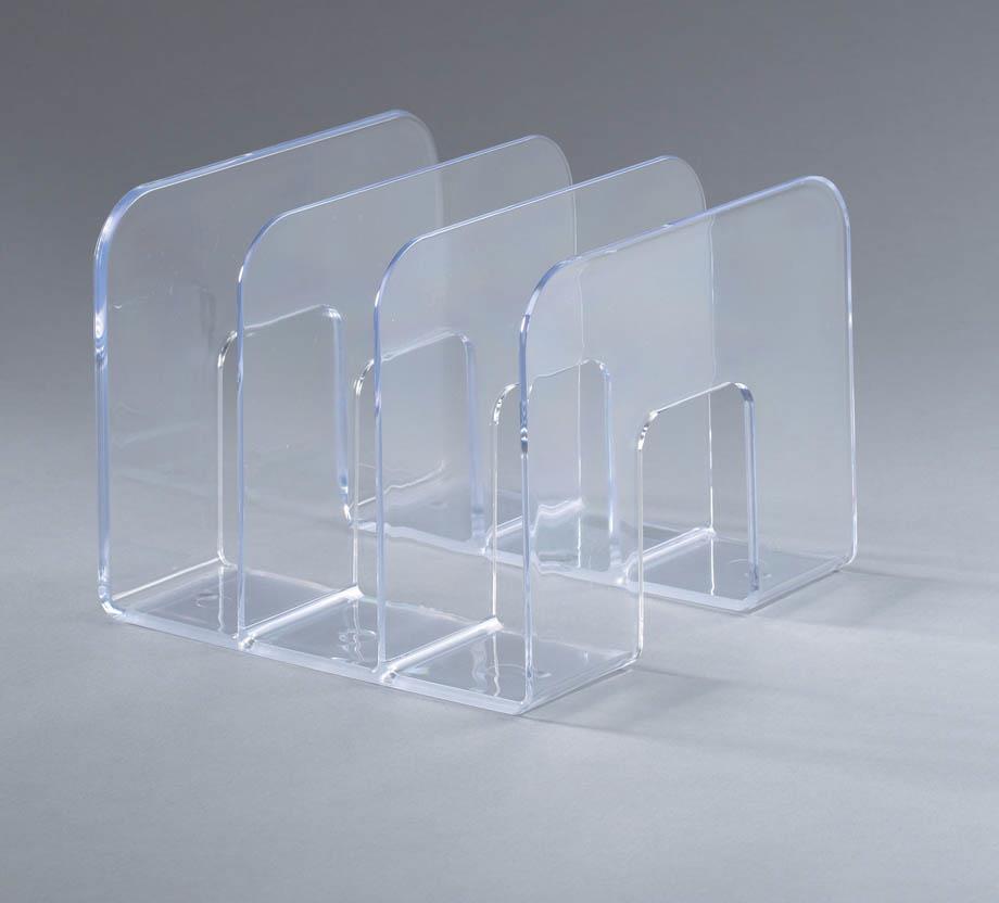 Stilsko oblikovano stojalo za shranjevanje katalogov, brošur ipd. Trije razdelki v širini 65 mm.