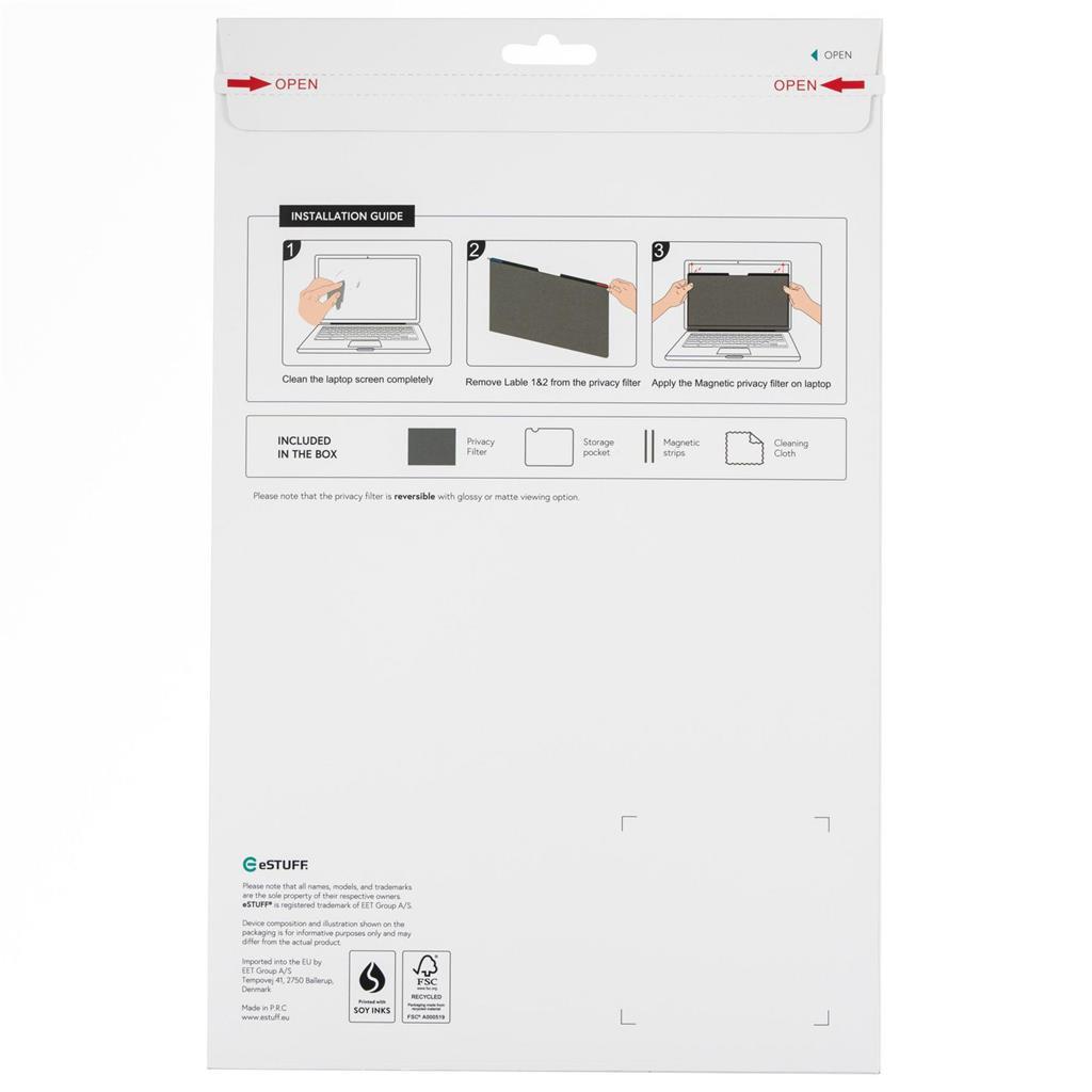 eSTUFF Magnetic Privacy Filter – Enostavna zasebnost za vsakodnevno zaščitoZasnovan za prenosnike z okvirji, a brez vgrajenih kovinskih okvirjev, ta magnetni filter zasebnosti vključuje samolepilne magnetne trakove za hitro in varno pritrditev na zgornji rob okvirja. Je praktična rešitev za strokovnjake, ki potrebujejo zanesljivo zasebnost na poti ali v pisarni.