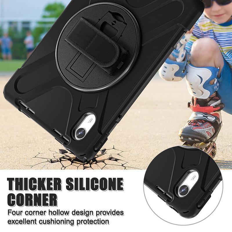 Vgrajeno 360° vrtljivo stojalo omogoča uporabo tablice v vodoravni in navpični legi. Vgrajena zaščita z zračnimi blazinicami varuje robove tablice pri padcu. Povišani robovi spredaj in okoli izreza za kamero nudijo boljšo zaščito kamere in sprednjega stekla pri padcih.